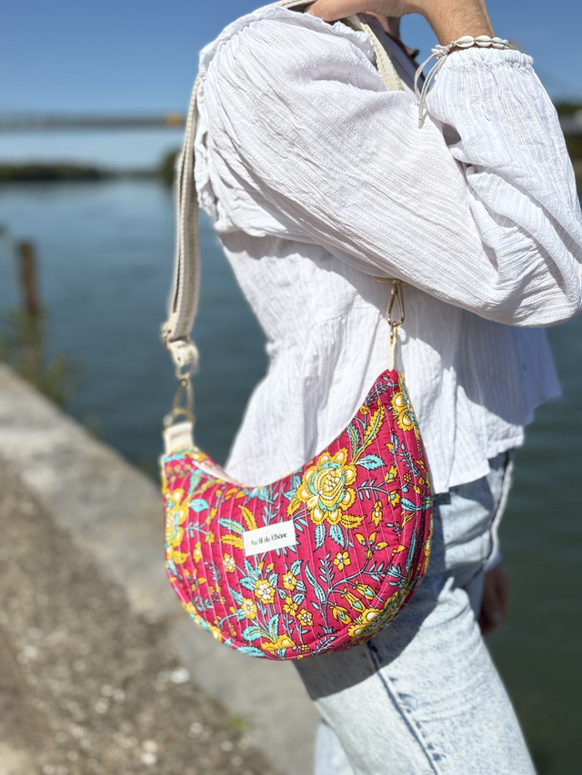 Apportez une touche de fraîcheur et de douceur à vos tenues avec notre sac croissant fait main. Confectionné dans un tissu en coton matelassé, ce sac séduit par sa forme arrondie et sa légèreté.
